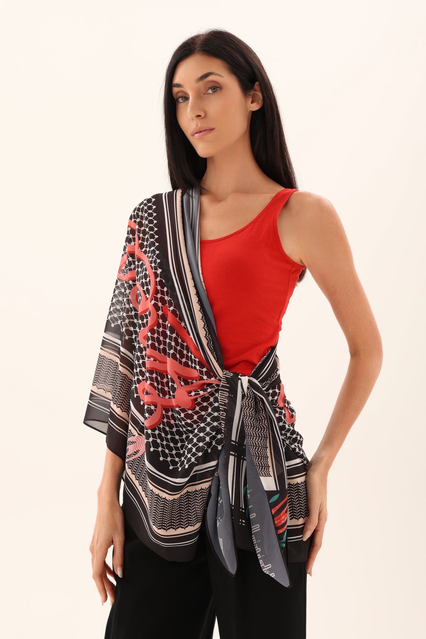 Embrace bold cultural expression with this soft chiffon rectangular scarf, designed to drape effortlessly with a light, airy feel. Set against a deep black base, the design features striking Arabic calligraphy in vivid red layered over intricate geometric patterns inspired by traditional textile motifs. A contrasting border frames the artwork, adding structure and balance to the fluid silhouette. Lightweight and elegant, this scarf blends heritage, modern design, and expressive movement—perfect for statement styling.