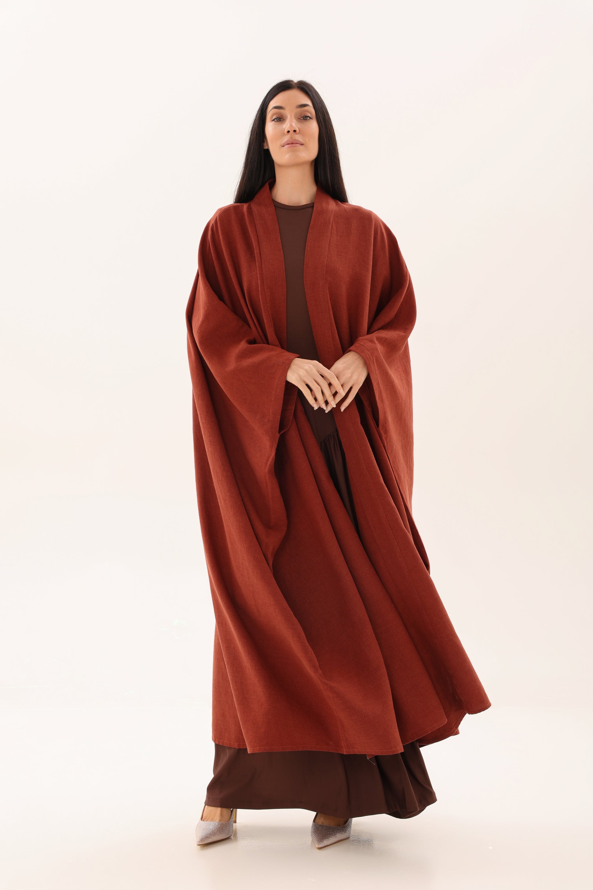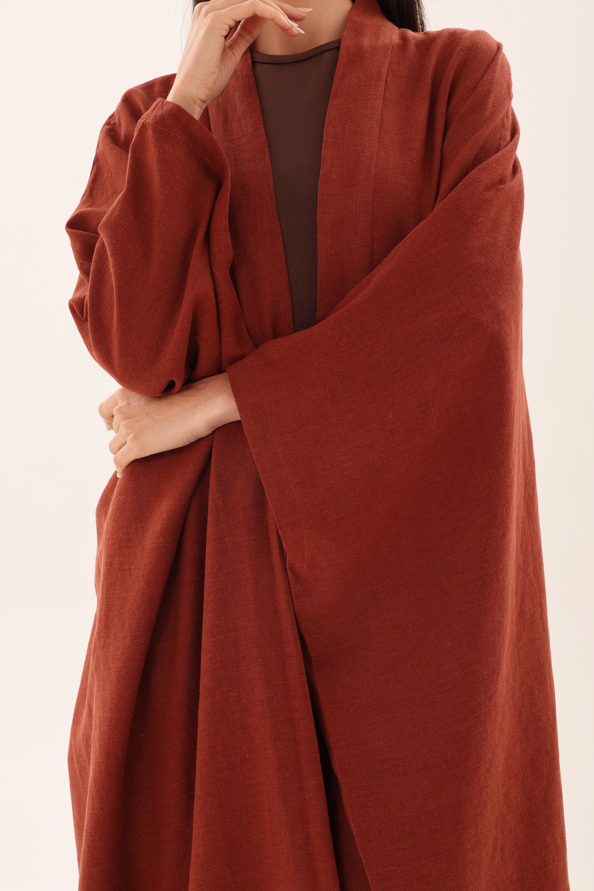 Embrace soulful minimalism with this flowing kimono crafted from lightweight textured Linen in a deep terracotta tone.
