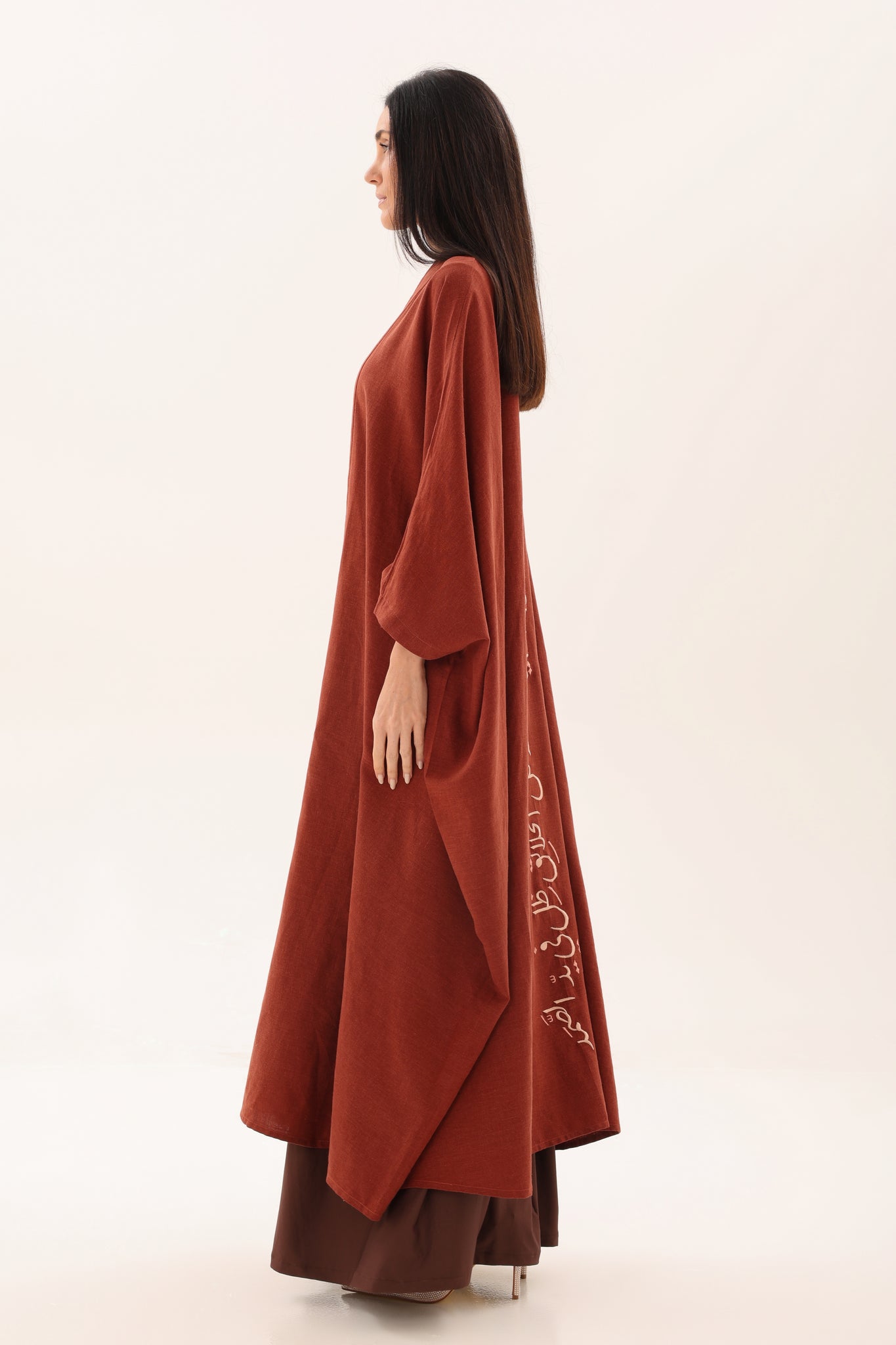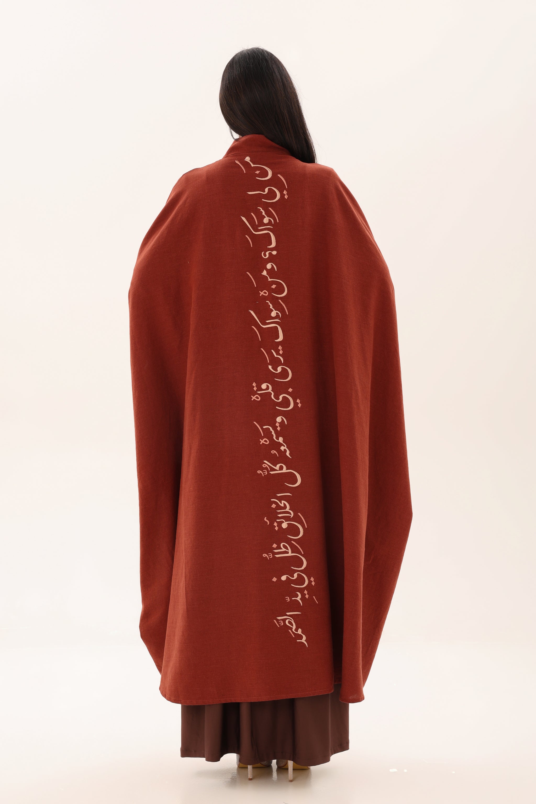 A vertical Arabic calligraphy print in soft ivory runs down the back, adding depth, meaning, and quiet strength to the design. The clean silhouette and fluid drape allow the fabric and words to speak for themselves, creating a refined statement rooted in culture and emotion.