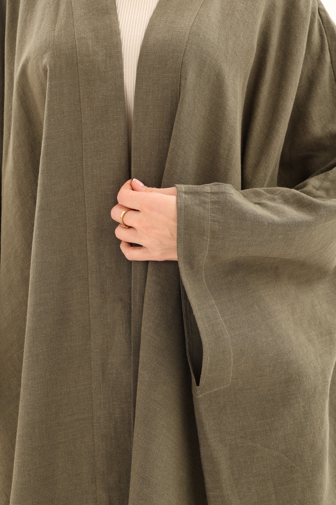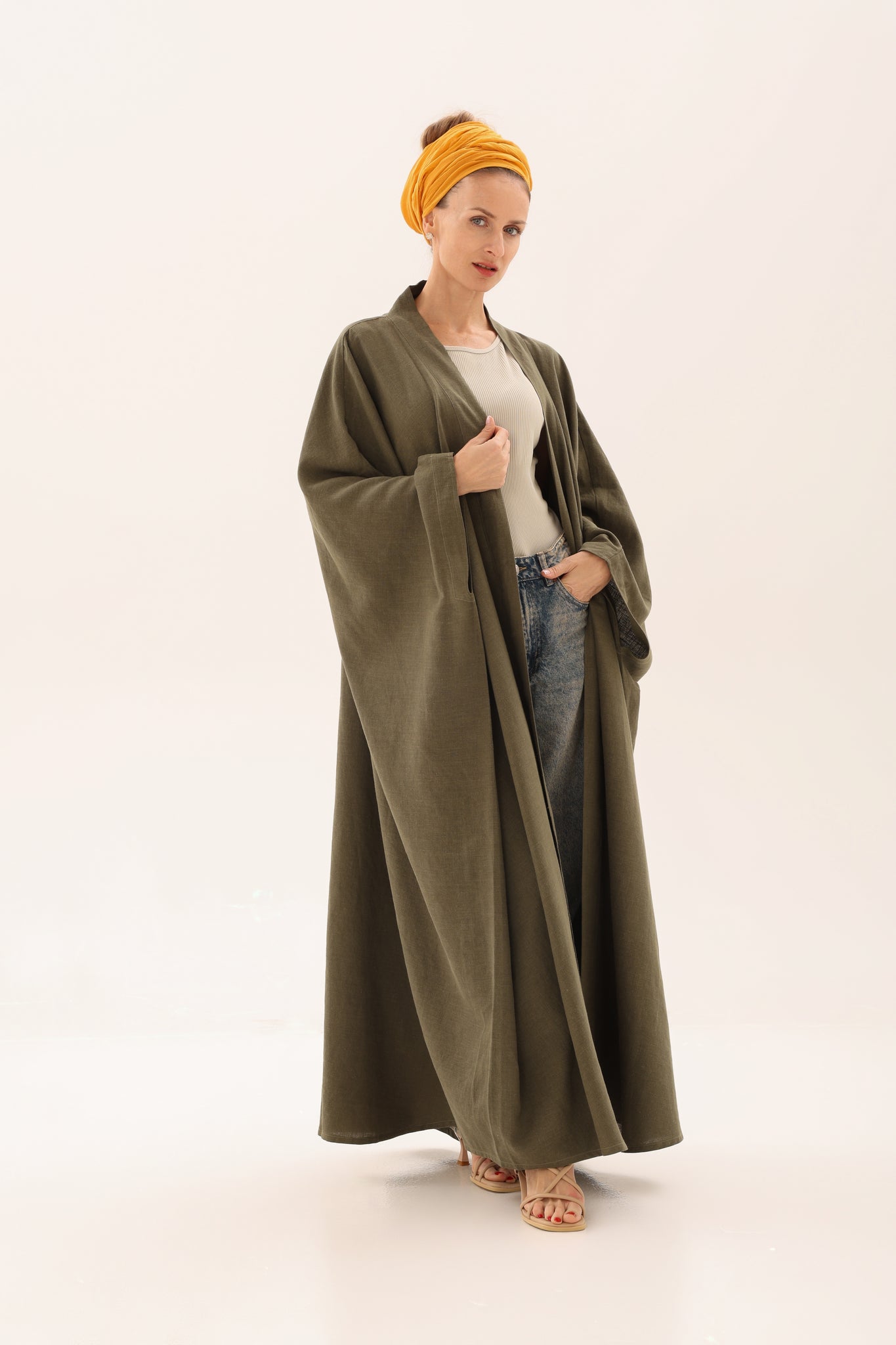 Embrace grounded elegance with this flowing kimono crafted from lightweight textured Linen in a deep olive tone.