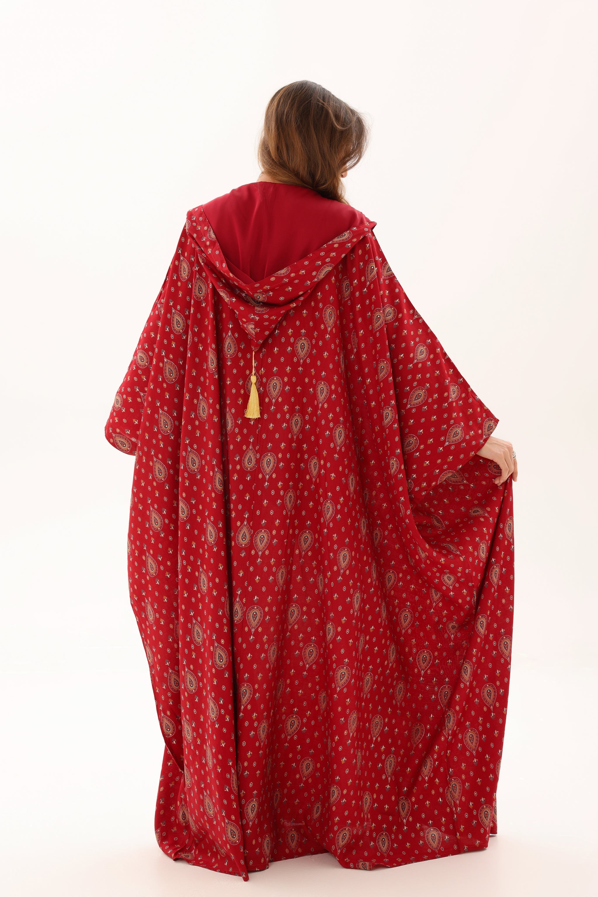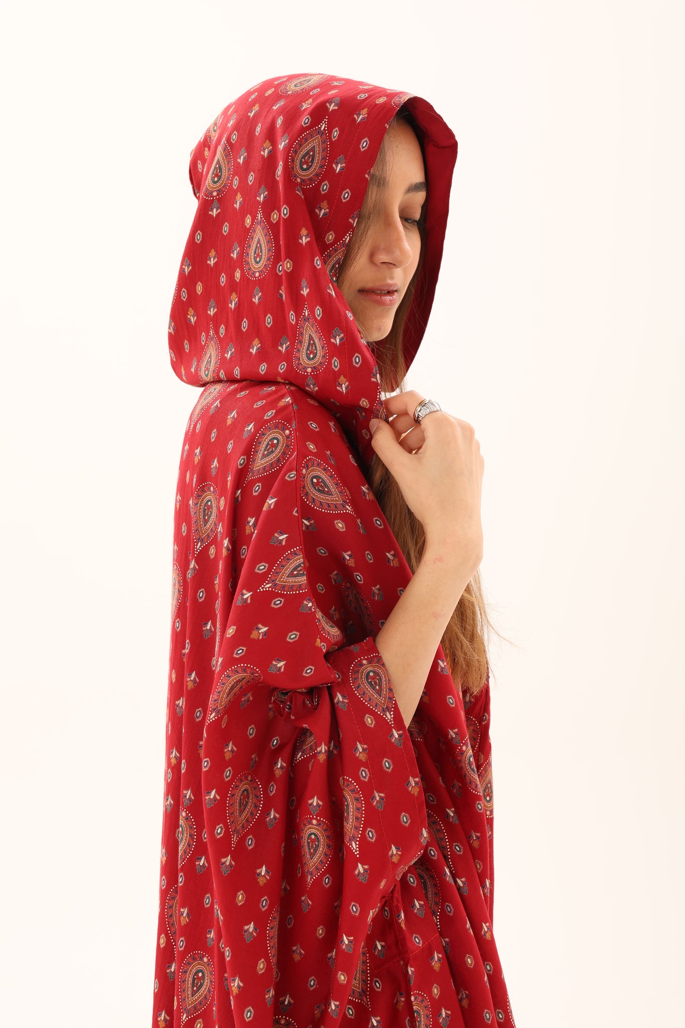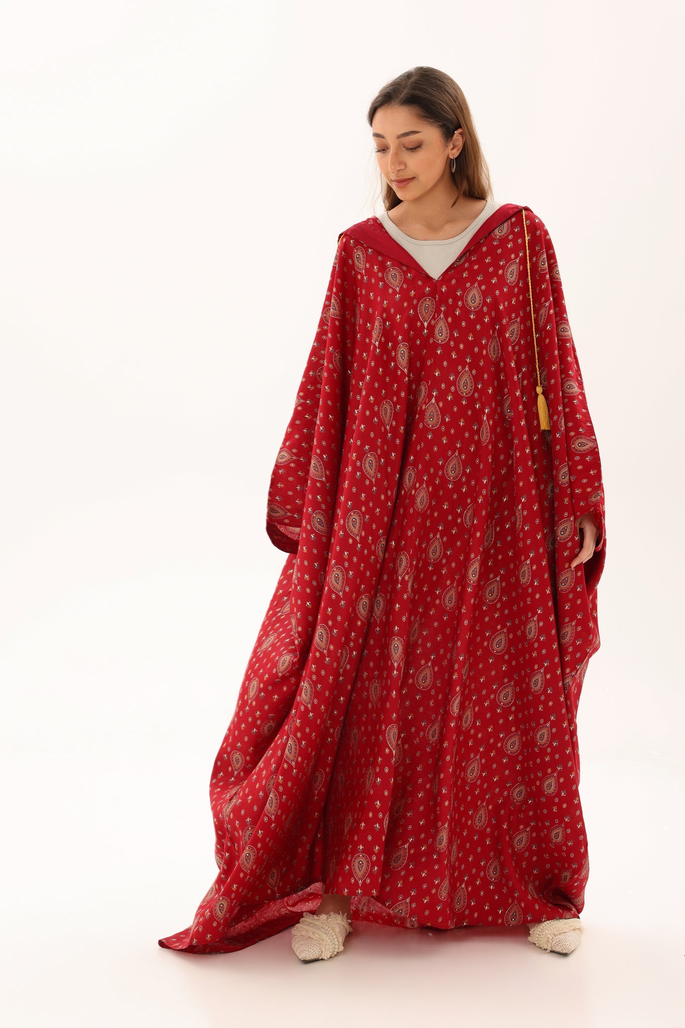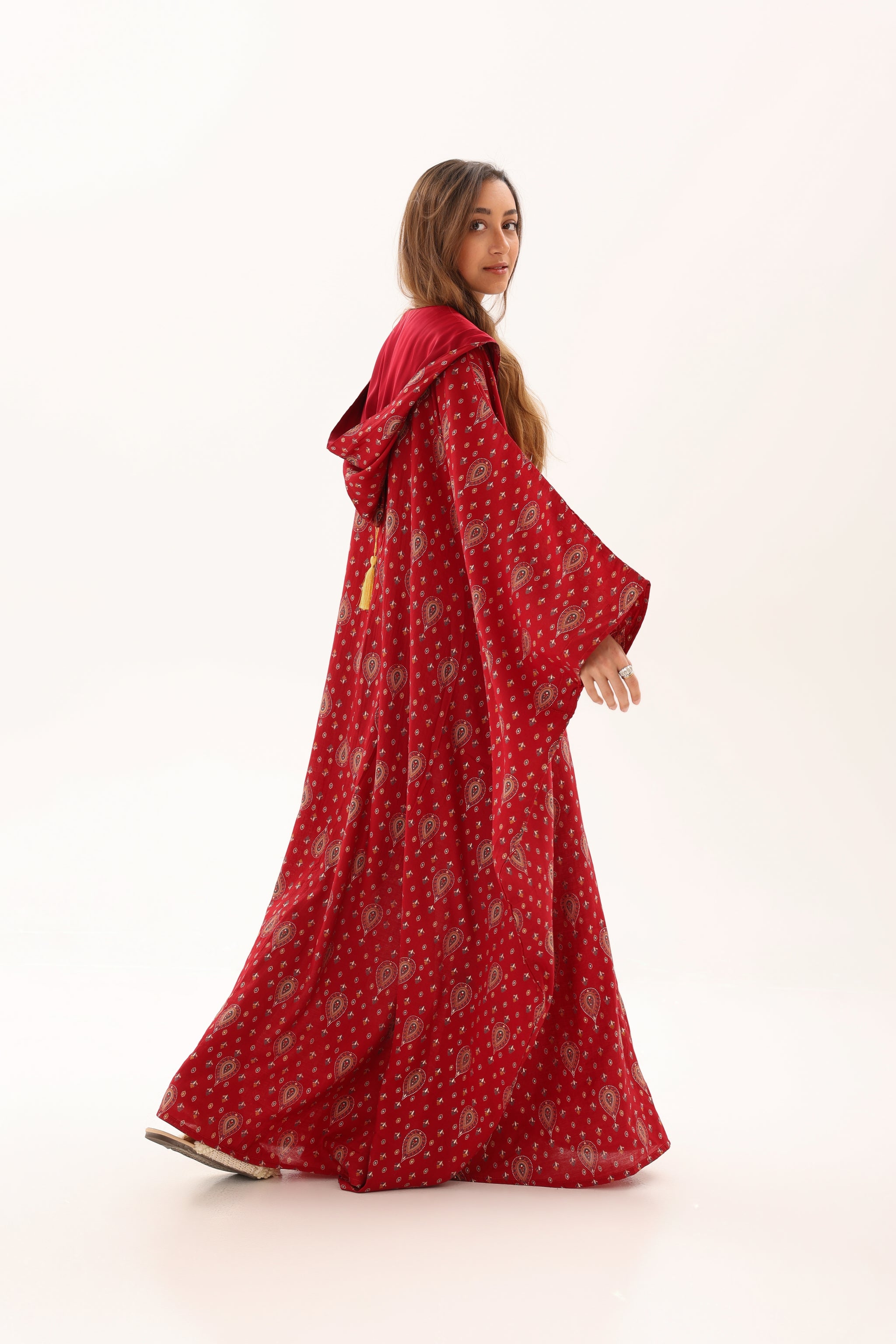 Set in a rich red hue, the design features an all-over traditional motif that adds warmth and cultural depth. The relaxed, flowing silhouette is enhanced by wide sleeves and a softly draped hood with subtle tie detailing, creating effortless movement and comfort.